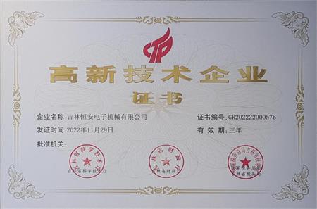 熱烈祝賀:吉林恒安電子機械有限公司在2022年吉林省科學技術廳高新技術企業(yè)評定工作中,榮獲高新技術企業(yè)證書。